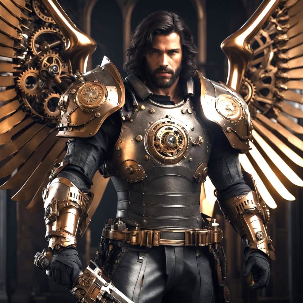 This image shows a portrait of a male angel warrior wearing steampunk armor. His mechanical wings are crafted from brass plates and clockwork, with steam venting from the joints. The image features moody lighting in a cinematic composition.