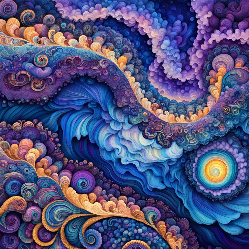 A vibrant image of swirling iridescent clouds and nebulas forming hypnotic patterns. The artwork evokes a cosmic atmosphere with fractal energy and hidden astral creatures, rendered with textured 3D effects.