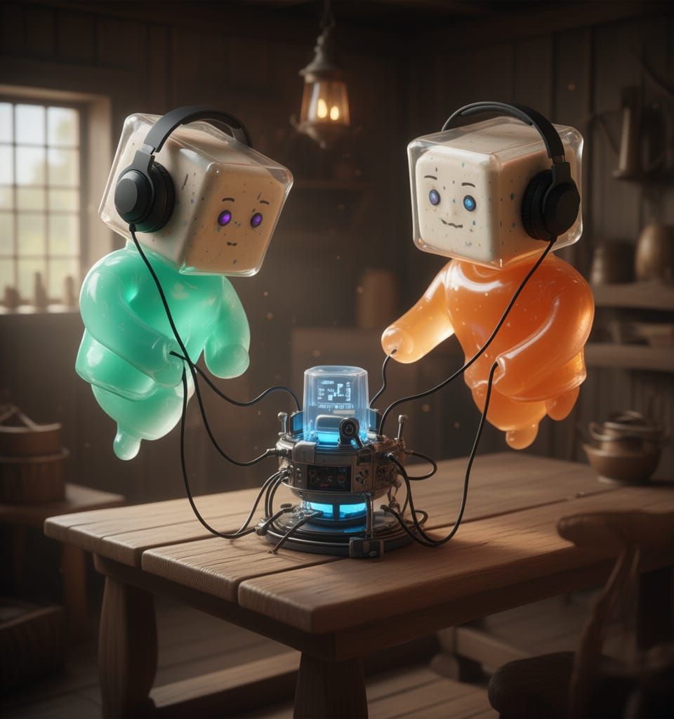 This image depicts two levitating figures with square heads, made of porcelain and chewing gum, wearing headphones and linked to a futuristic machine. Rendered in a hyper-realistic Renaissance museum style with natural lighting.