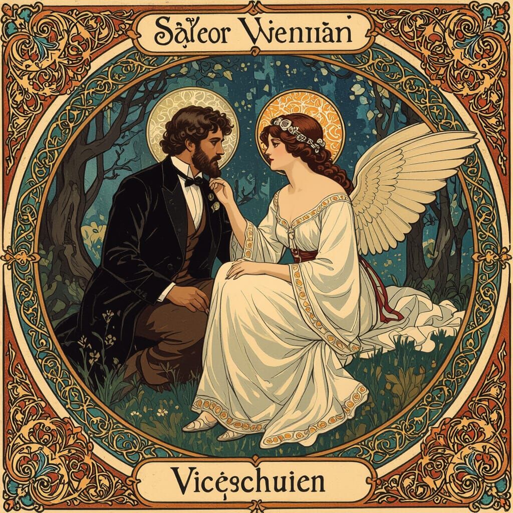 A serene forest landscape featuring trees and flowers in tranquil colors. The naturalistic scene is rendered with intricate details in a romantic and painterly style.