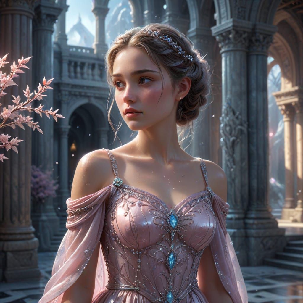 This image shows a magical princess with braided hair in an ice-pink gown, standing in a fantasy palace. It features hyper-realistic textures and cinematic lighting, rendered as detailed digital painting.