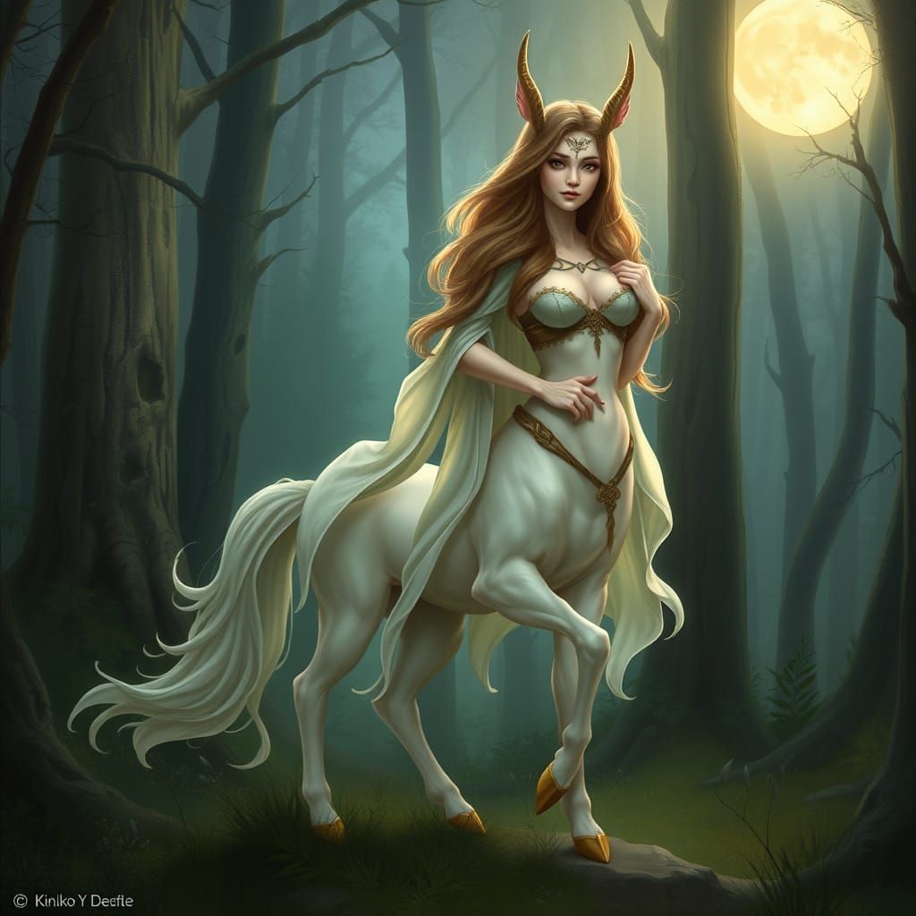 This image shows a mystical female centaur standing in a lush, moonlit forest, surrounded by an ethereal glow, with intricate details and a touch of realism.