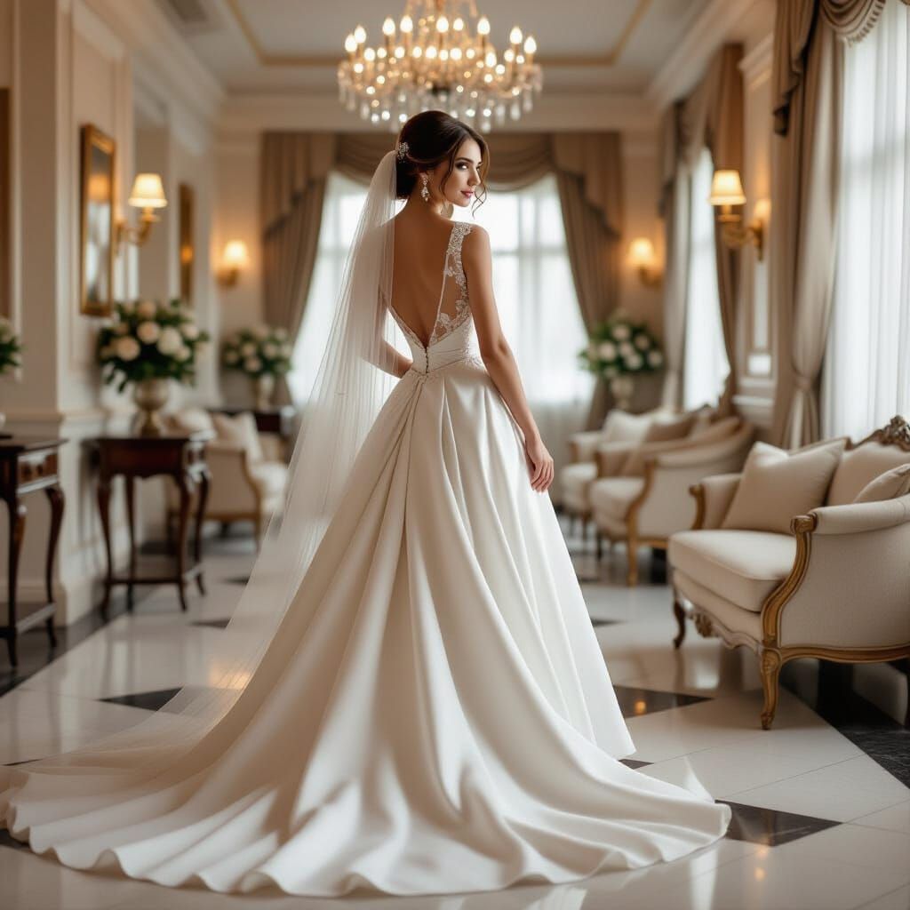 This image depicts a young woman in a white wedding dress preparing to enter a wedding hall. The scene evokes a soft, romantic mood, rendered with ultra-realistic detail in a cinematic, maximalist style.