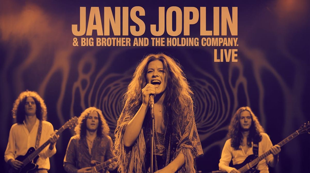 This image shows a vintage concert poster featuring Janis Joplin in performance. The poster has a 1960s psychedelic aesthetic with bold typography and a vibrant color palette.