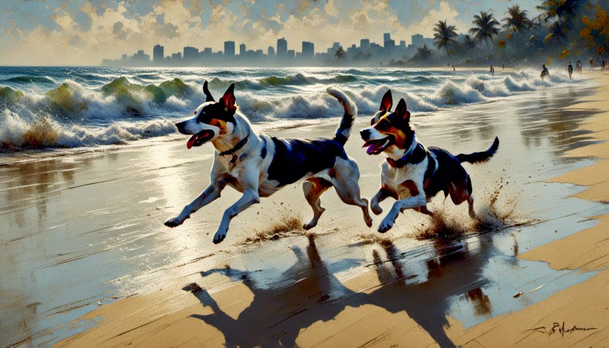 A serene impressionist painting of a happy dog running on a sandy beach. The artwork features soft brushstrokes, warm tones, dynamic shadows and a painterly style to create a serene coastal scene.