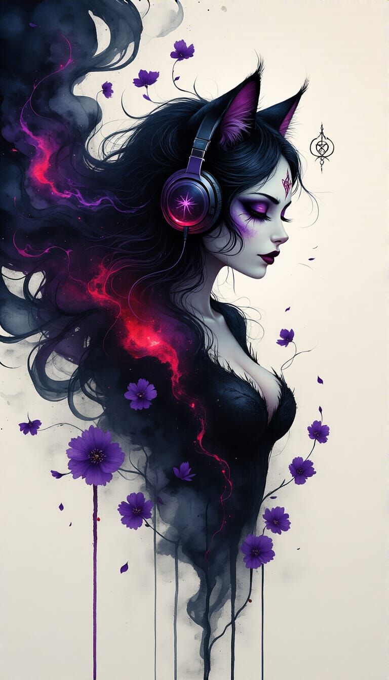 A vibrant portrait of a cosmic cat woman amidst swirling colors. The image showcases a blend of goth and arcane elements, with glowing glyphs and cosmic glitter accents. It captures a mystical rave atmosphere.