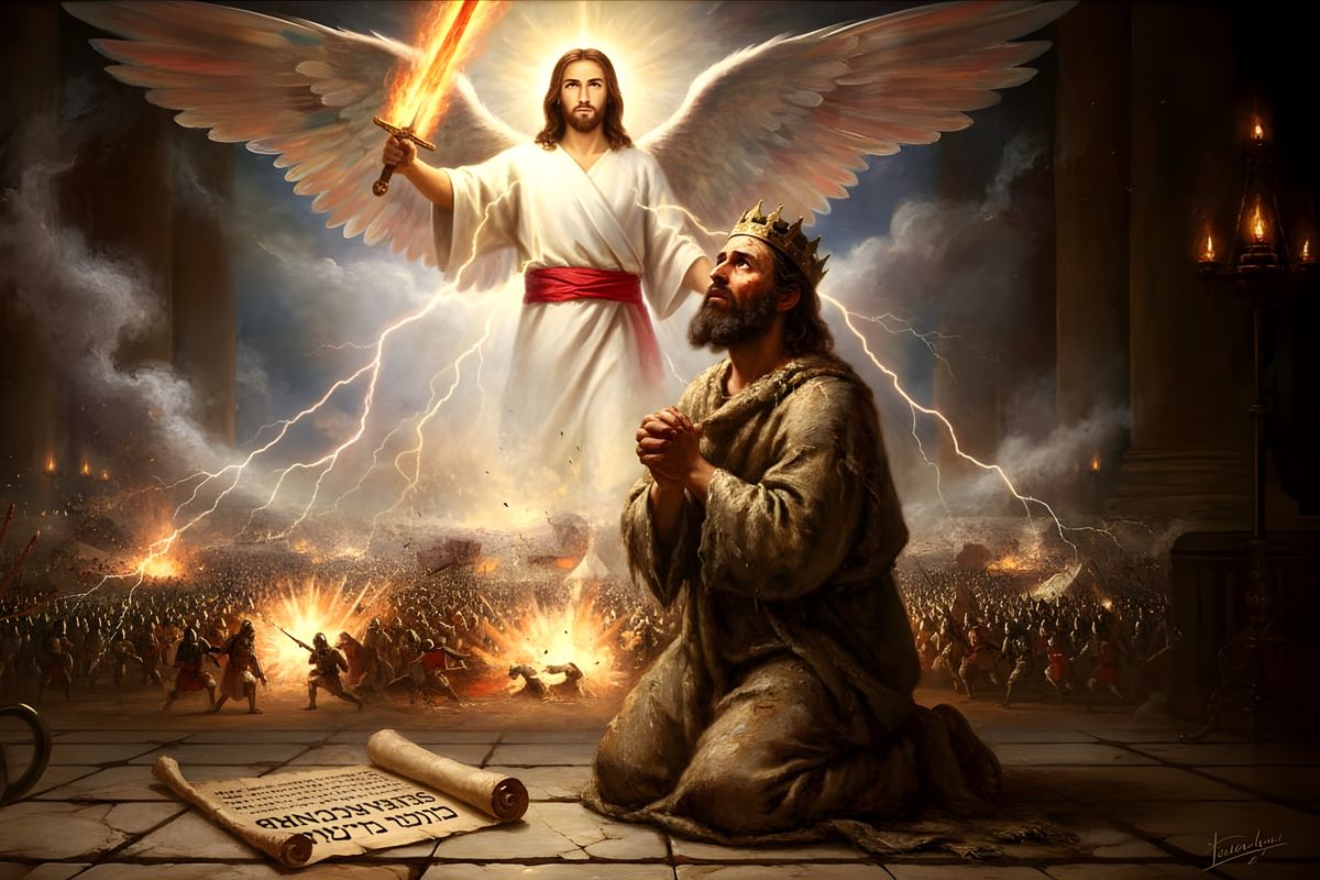 This image depicts King Hezekiah praying in Solomon's Temple, with the Angel of the Lord intervening against the Assyrian forces outside Jerusalem. Rendered in a dramatic, spiritually fervent realism oil painting style.