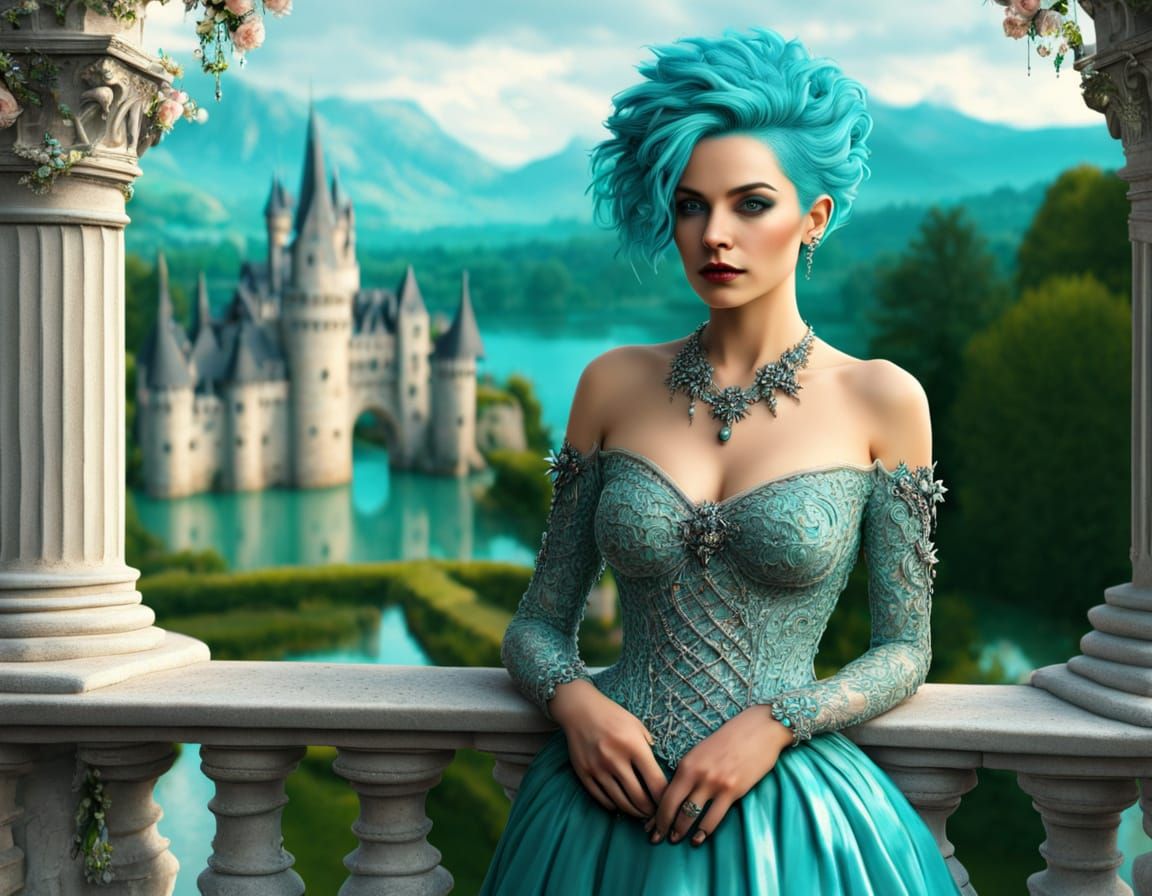 A hyperrealistic image of a woman with turquoise spiky hair in a gothic wedding dress. She stands on a castle balcony overlooking a garden and lake.