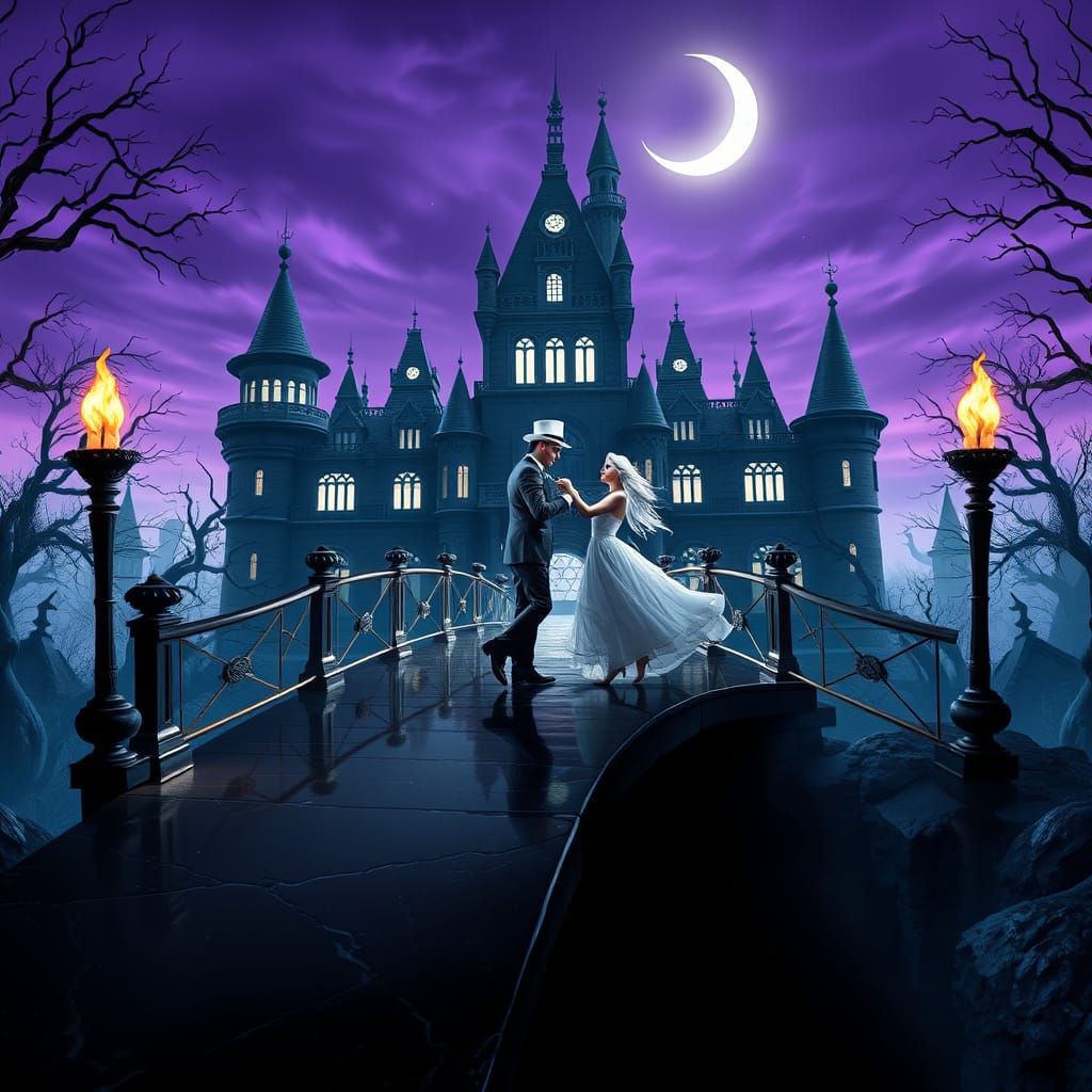 This image shows a romantic couple dancing on a mystical castle drawbridge under a deep purple sky with a crescent moon. The scene features intricate details, high-contrast colors, and a sense of mystery.