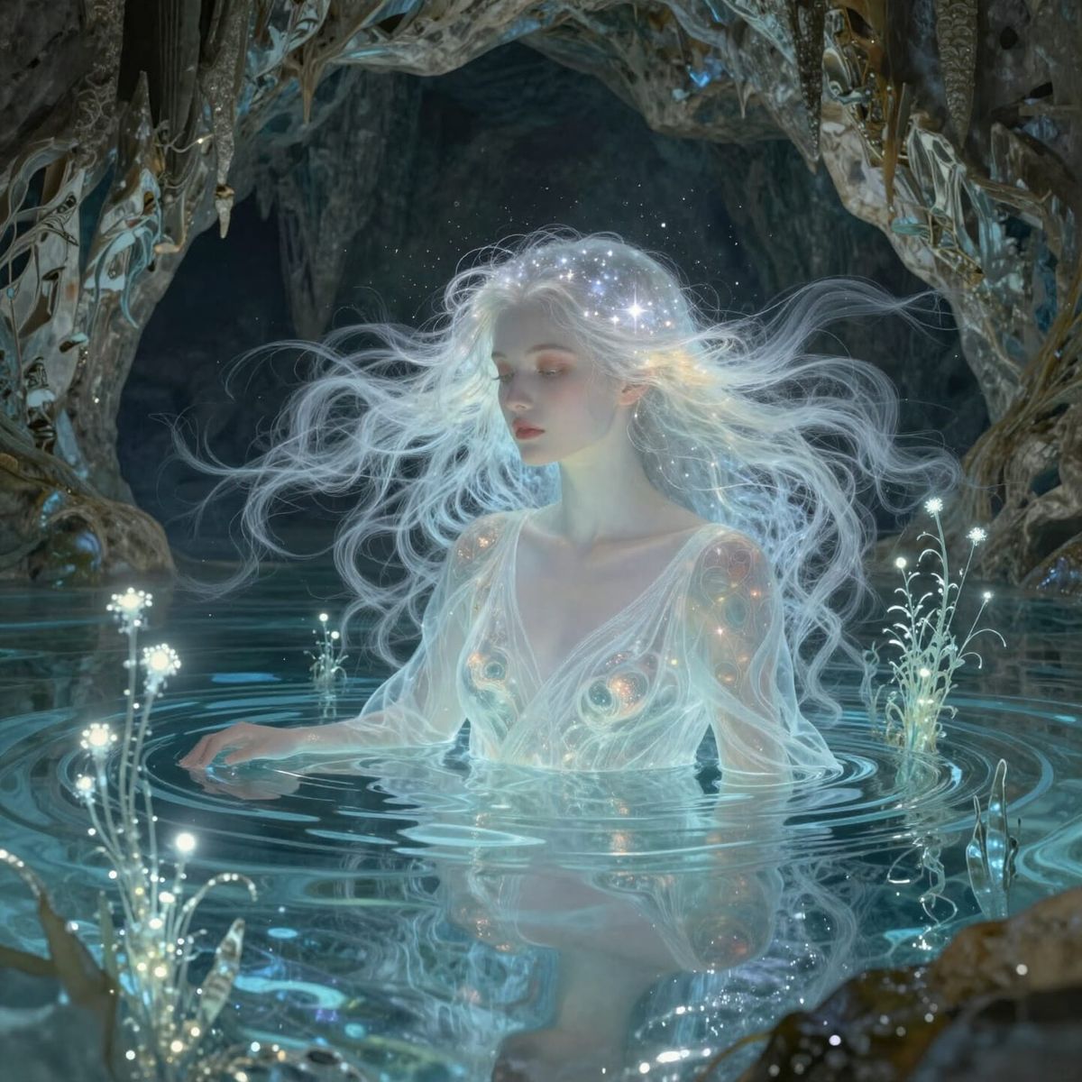 A serene portrait of a woman with starlight hair submerged in a glowing grotto. This magical realism artwork features otherworldly plants and soft, diffused lighting.