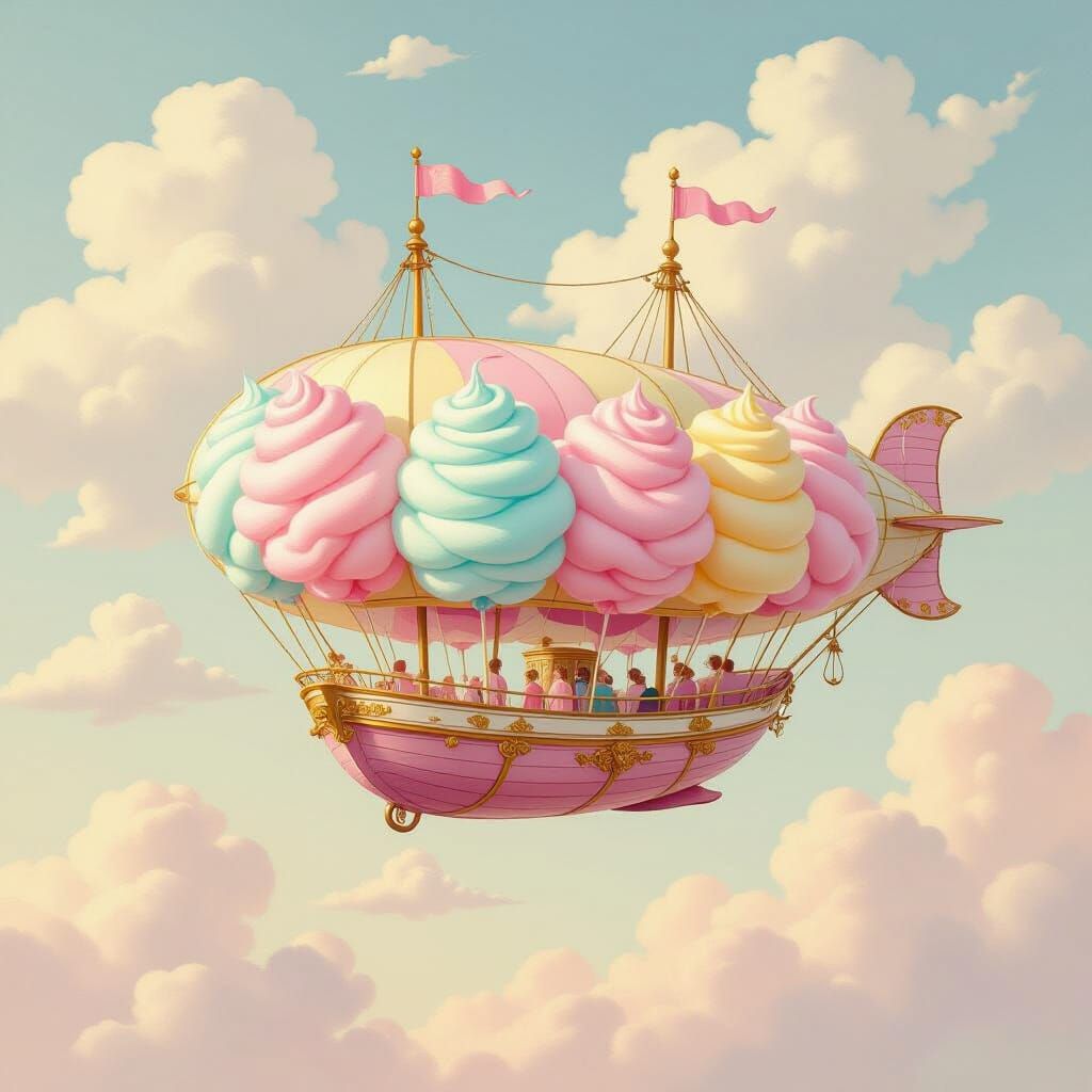 A whimsical cotton candy shop aboard a vintage airship floats serenely in the sky. The digital artwork features lush pastel colors, ornate golden details, and a dreamy, highly detailed aesthetic.