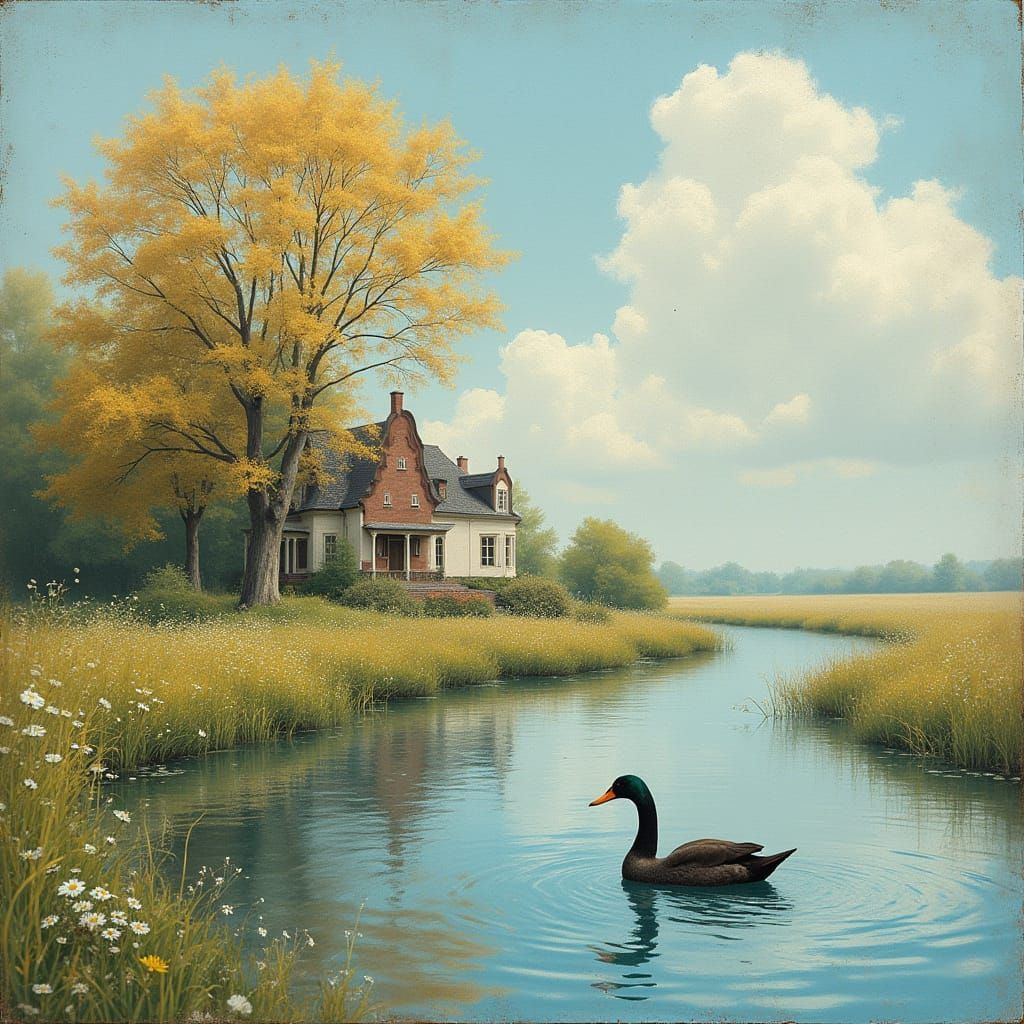 This enchanting image depicts a 3D fountain pen with shimmering iridescence suspended in mid-air, writing on vintage paper with a subtle, wavy texture. A serene scene unfolds, featuring a calm lake reflecting against a soft, white cloudy sky, a swan gliding effortlessly across the water, and a picturesqu...