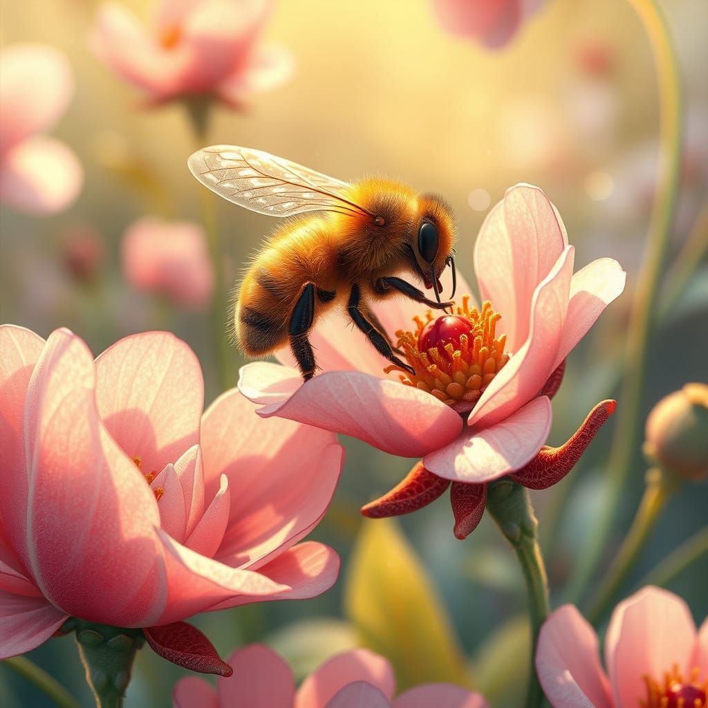 This enchanting watercolor and oil painting features a whimsical scene of a busy bee collecting pollen from delicate flowers in a lush, idyllic landscape, with intricate shadows and swirling patterns, evoking a sense of peaceful tranquility.