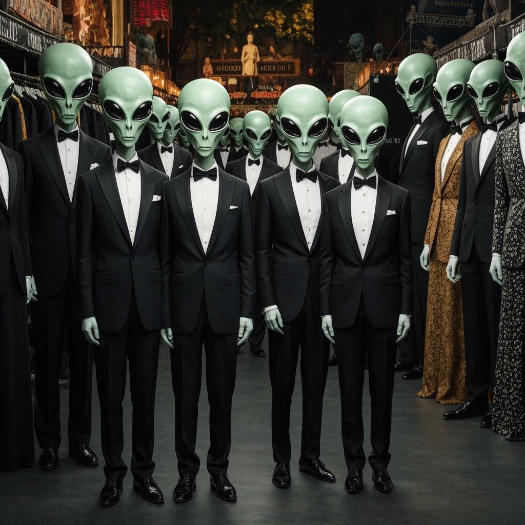 This image shows a bustling alien marketplace populated by extraterrestrial beings. All the aliens are depicted wearing formal tuxedos in this unusual and humorous scene.