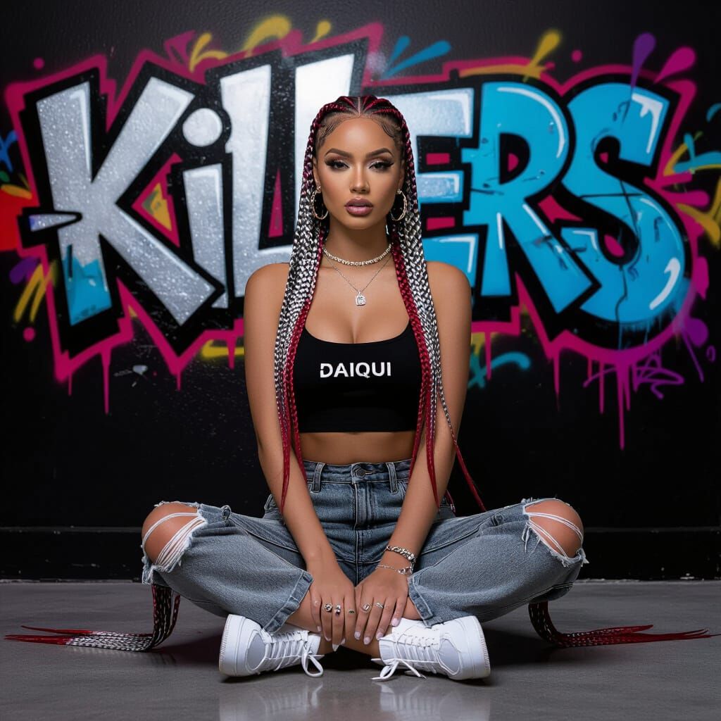 This image shows a stylish woman with long braids, wearing a crop top and ripped jeans, sitting against a graffiti wall. Her outfit and the vibrant graffiti blend street style with futuristic art.