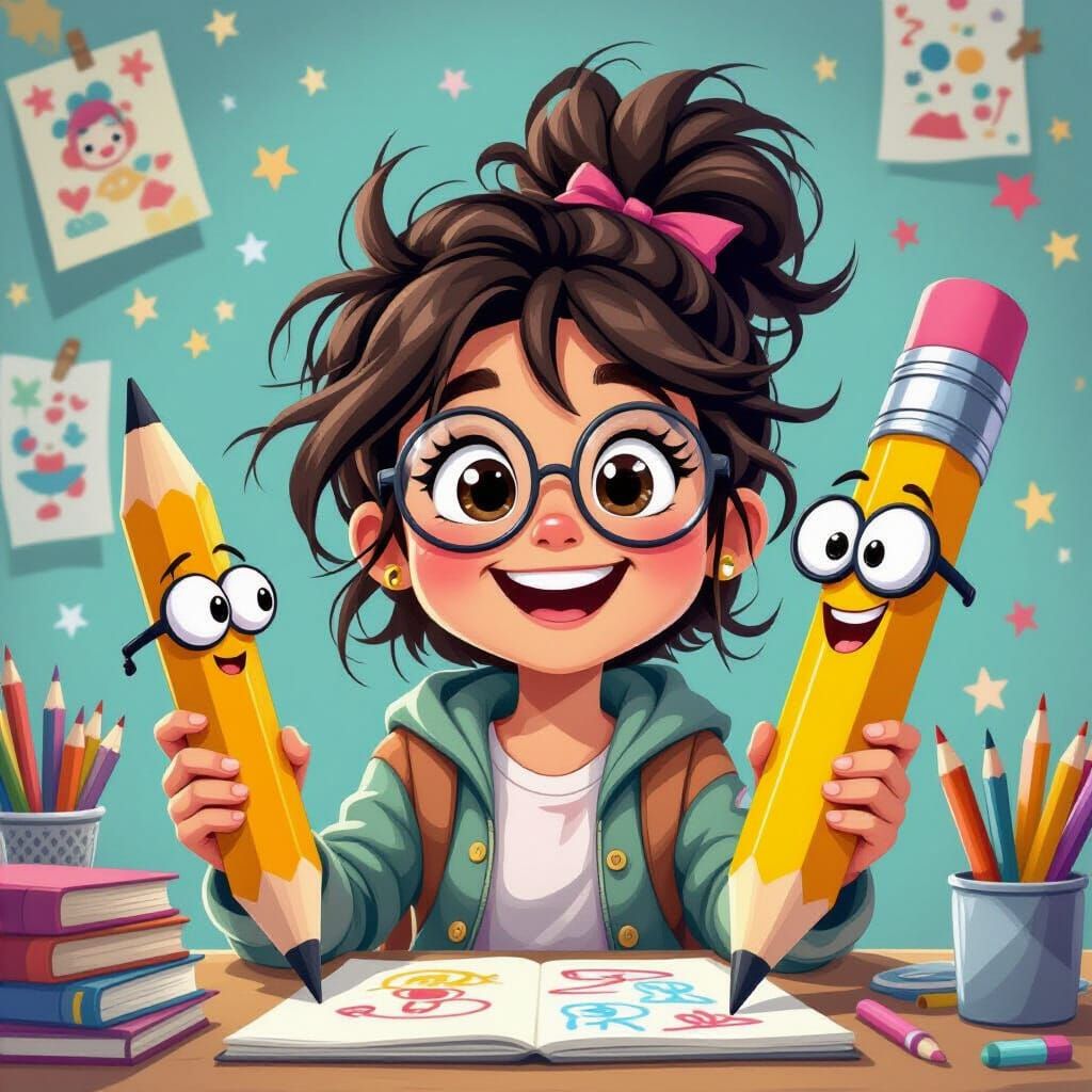 This image shows a cheerful cartoon pencil character with large eyes and spectacles, alongside a girl drawing. The scene has a vibrant, semi-realistic animation style, creating a playful, whimsical atmosphere.