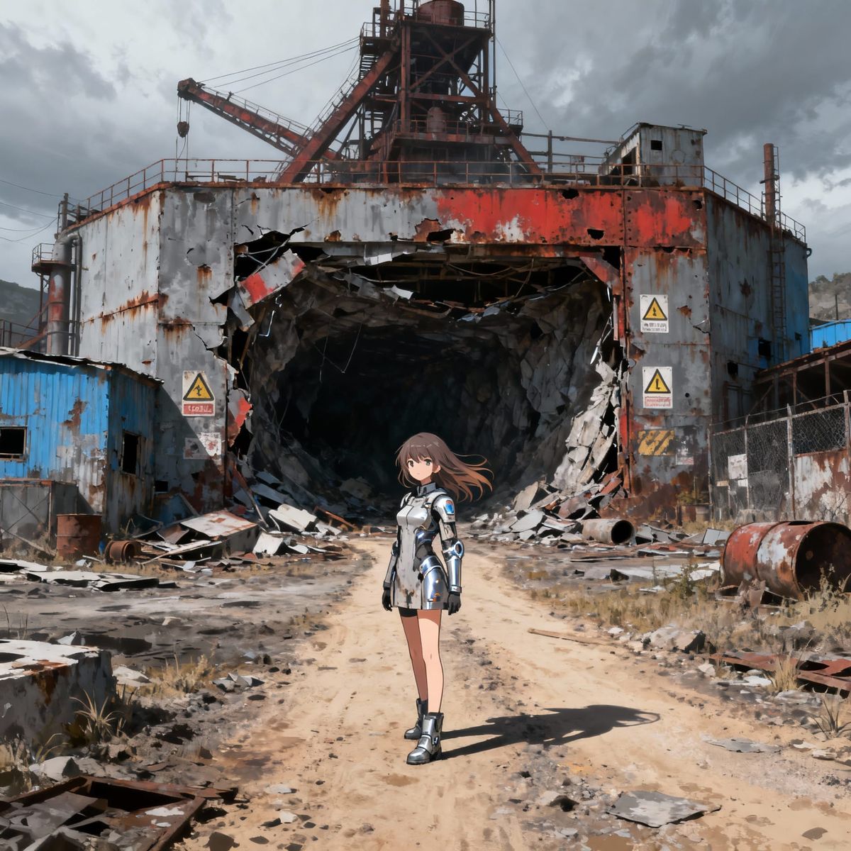 This image shows a full-body view of a sci-fi anime girl walking towards a desolate, rusted industrial outpost with an open pit mine.