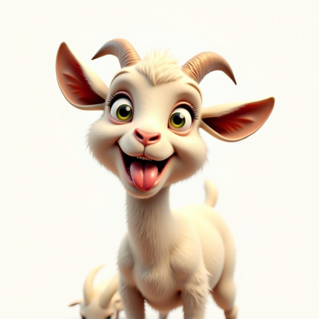 This image shows an adorable, happy goat rendered in a highly detailed CGI cartoon style. The silly goat is sticking its tongue out, engaging directly with the viewer.