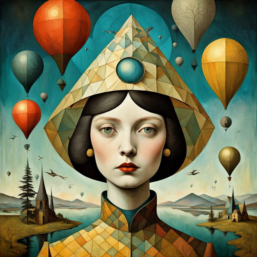 A striking picture of a biomechanical, surrealist landscape filled with chrome balloons and molecular structures. The image is rendered in a cubist abstract style with warm lighting and deep shadows.