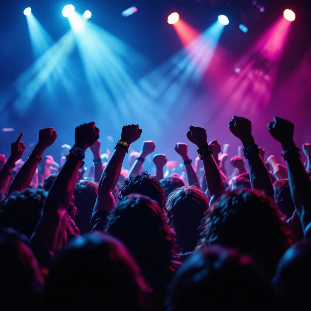 This image captures a fervent rock concert crowd, faces contorted in ecstasy under intense blue and magenta stage lights. The scene evokes raw energy with a gritty, high-contrast photographic style.
