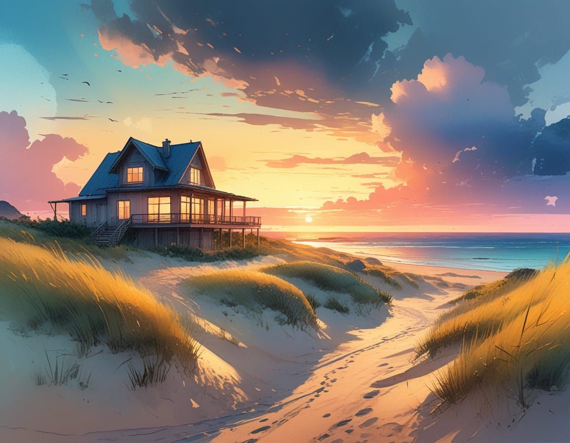 Cozy dunes overlooking a summer meadow beach house; twilight sunrise; clear and reflective seascape; twilight clouds