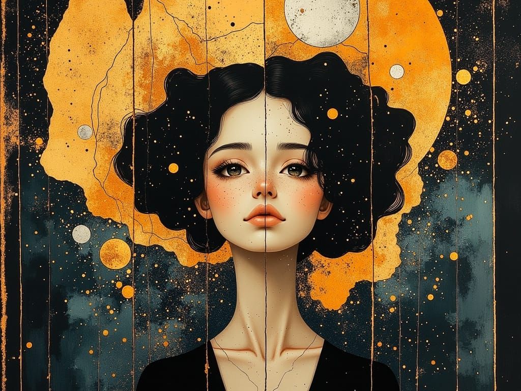 A surreal image of a woman with sharp features against a geometric stained-glass background. The artwork features an otherworldly fantasy aesthetic with intricate details, dynamic lighting, and a playful use of shadows.