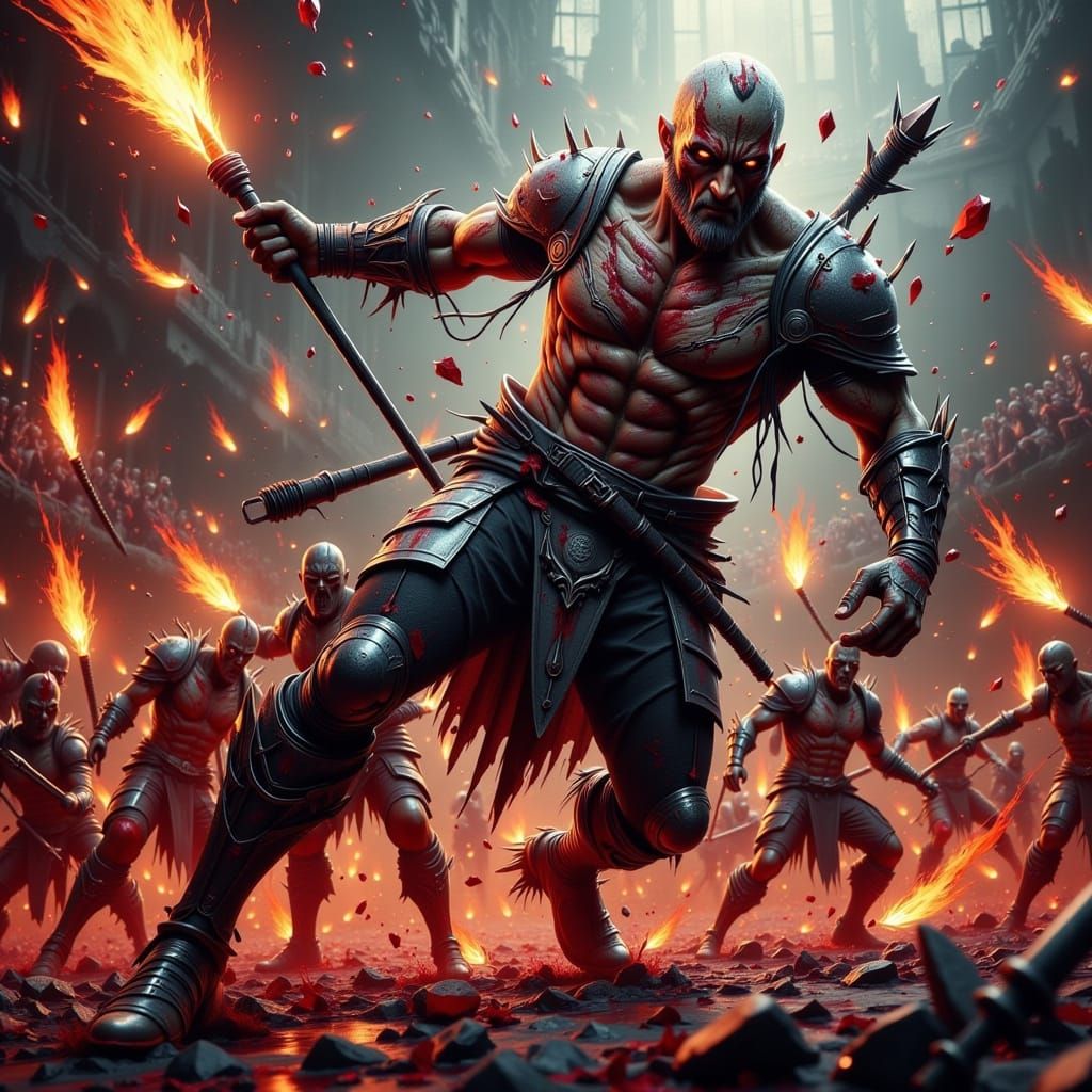 A muscular warrior in tattered armor executes a devastating kick in a blood-soaked arena, amidst a flurry of punches and cheering crowds, in a dark, gritty scene evoking the raw energy of sci-fi and surrealist artwork, with bold, metallic textures and a sense of brutal intensity.