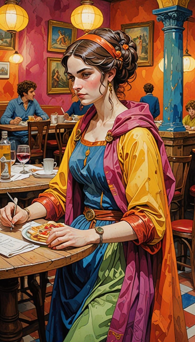 This image shows women in Greco-Roman costumes, rendered in a vibrant, cheerful watercolor and gouache style reminiscent of ancient Pompeii frescoes. Features volumetric lighting and a bold color palette.