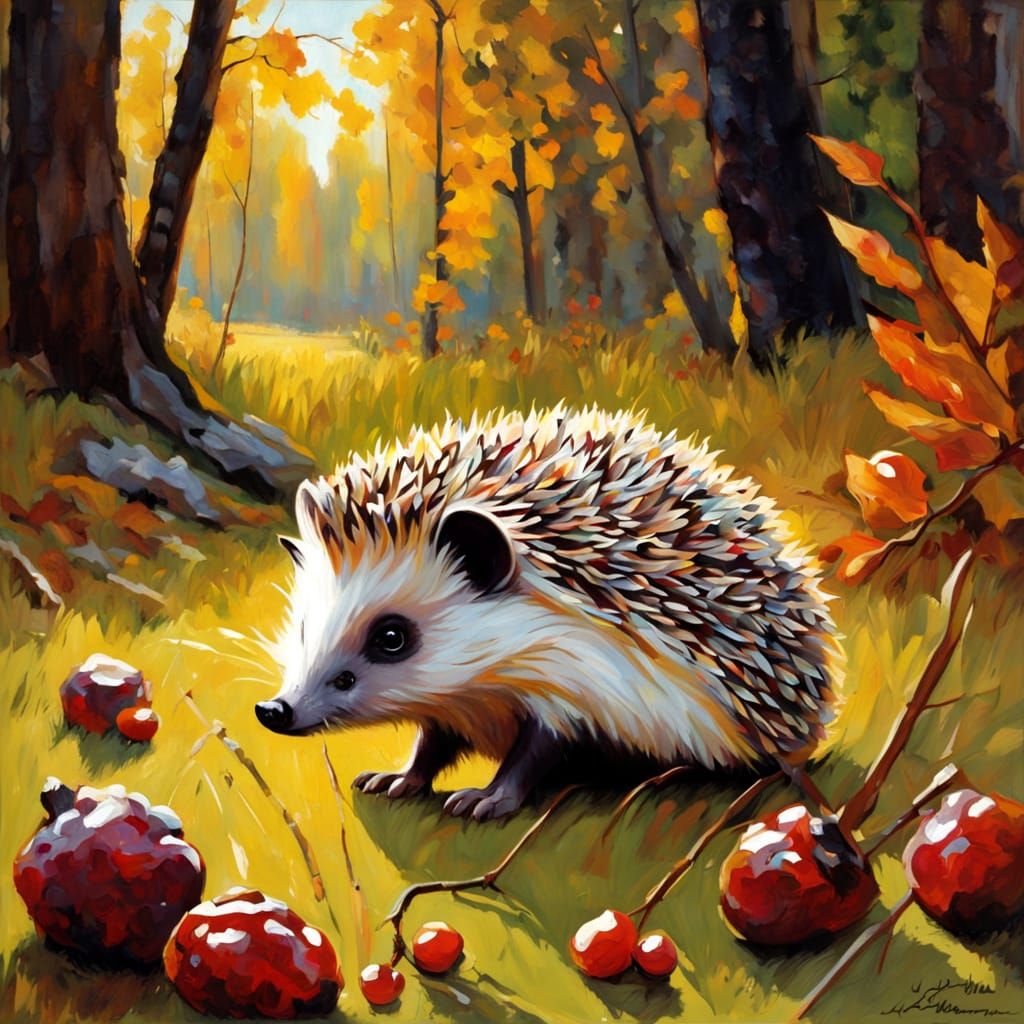This image shows a hedgehog gathering berries and nuts during autumn, rendered in a textured, impasto oil painting style with rich ochre and crimson hues.