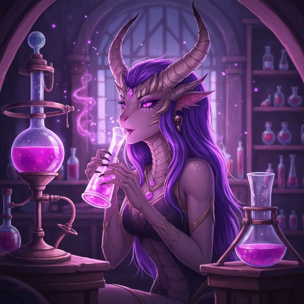 This image shows a dragon taur with amethyst eyes drinking a potion in a secret lab. This cel-shaded image features cinematic lighting, deep colors, and dynamic shadows, creating a magical ambiance.