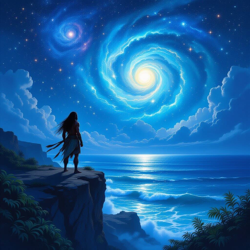 This image shows a lone indigenous warrior silhouetted against a vibrant, glowing sea. The night sky is filled with swirling galaxies and constellations, rendered with fine linework and a mystical, cinematic realism.