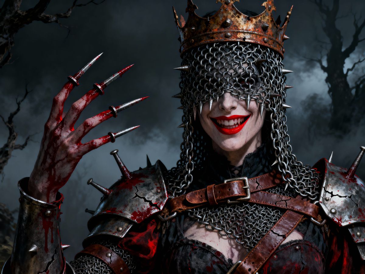 A dark gothic portrait of an evil princess with a sinister smile, wearing rusted armor and bloody nails. Features dramatic chiaroscuro lighting, reminiscent of classical engraving.