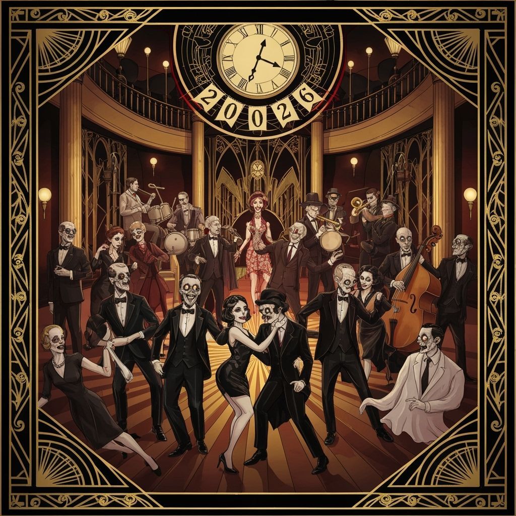 This image depicts a vintage New Year's Eve celebration in an opulent Art Deco ballroom, featuring undead guests dancing amidst dramatic geometric designs and a haunting jazz band. The scene uses sharp diagonal lines and a rich color palette of gold, black, and red to evoke a sense of unease and movement...