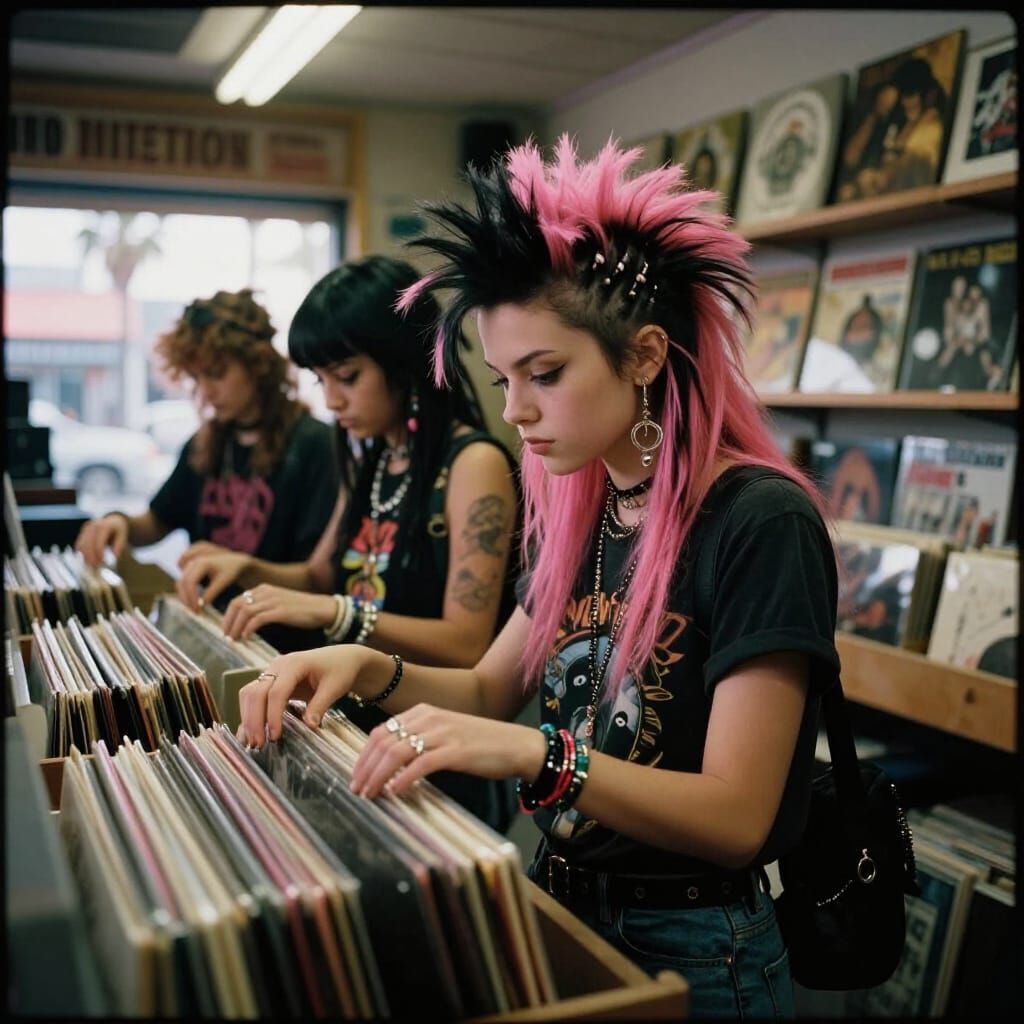A cinematic film still captures a young punk surfer girl with vibrant hair browsing records at Boardwalk Vintage. Features dynamic lighting and authentic film grain for a dramatic, masterpiece quality.