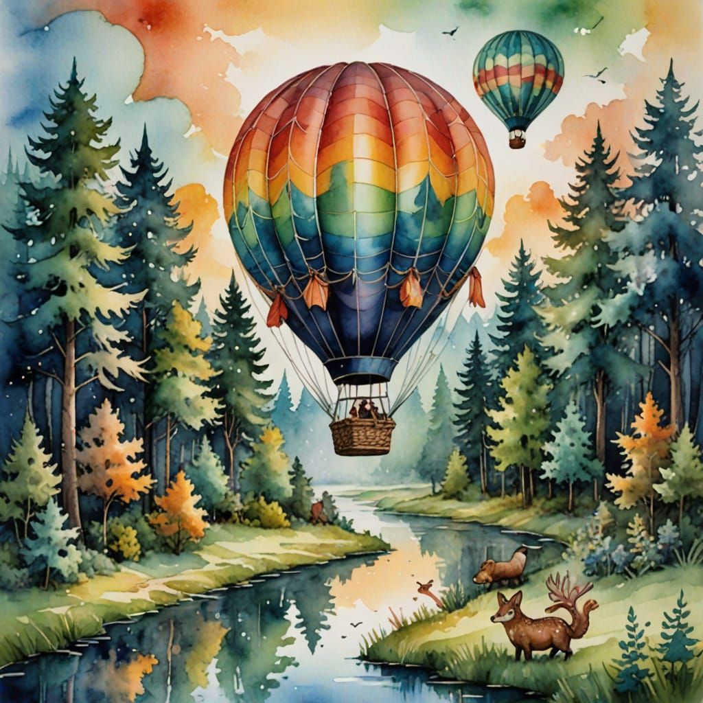 This image shows a hot air balloon with woodland creature elements. The artwork evokes an ethereal, impressionistic style with magical watercolor effects.