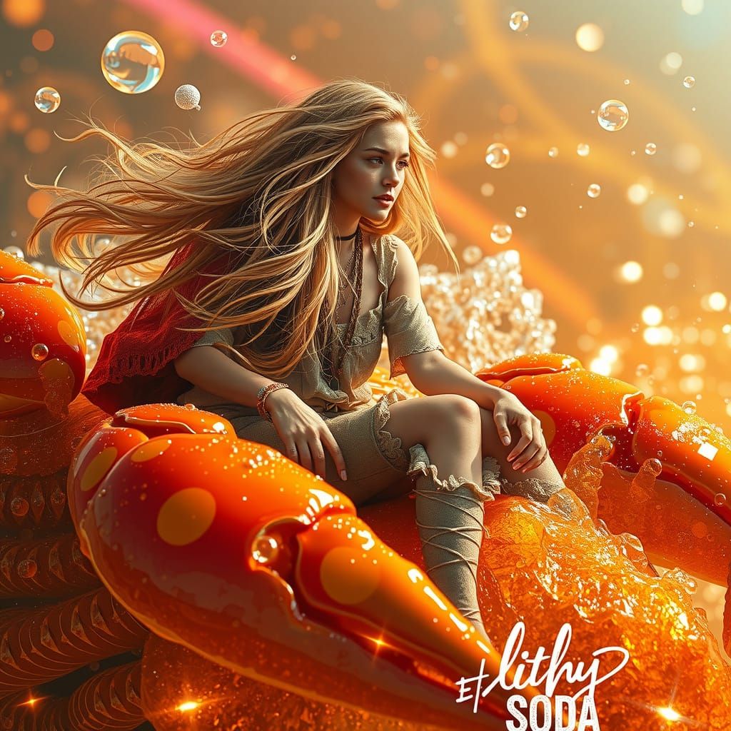 A captivating image shows a young woman with golden hair in bohemian attire, riding a giant gummy crab. The scene features vibrant colors, shimmering bubbles, and soft lighting, in a dreamy surreal style.