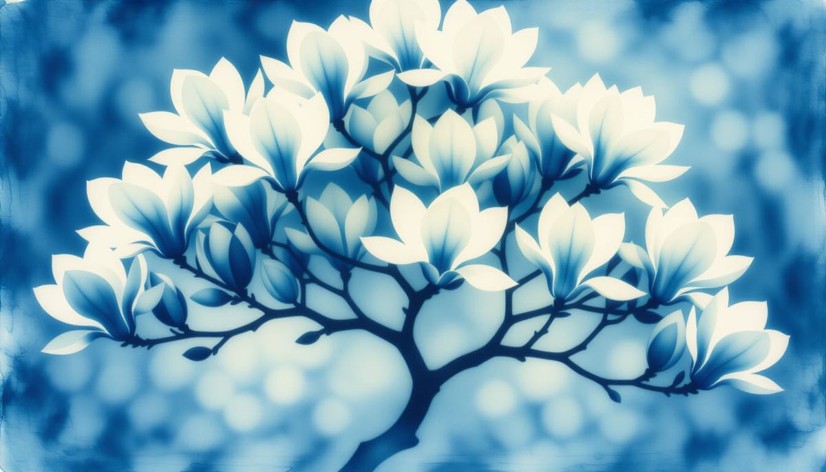 This image shows an ethereal magnolia blossom tree rendered in the distinct cyanotype style, evoking a serene and artistic natural scene.