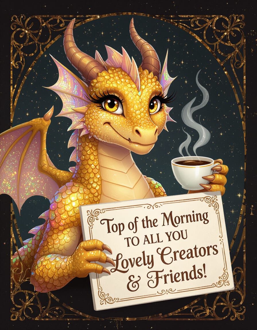 A vibrant image of a golden dragon enjoying a cup of coffee. This artwork evokes art nouveau styles with iridescent scales and a friendly greeting, rendered as digital art.