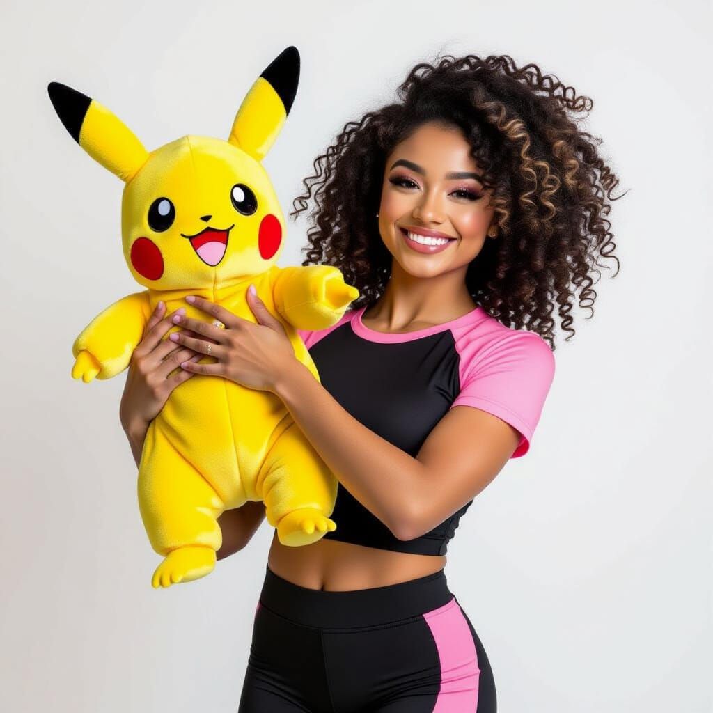This image features a cute ballerina with mixed heritage, curly dark brown hair, and athletic wear in pink and black. She is holding a Pikachu onesie, showcasing a unique blend of dance and pop culture.