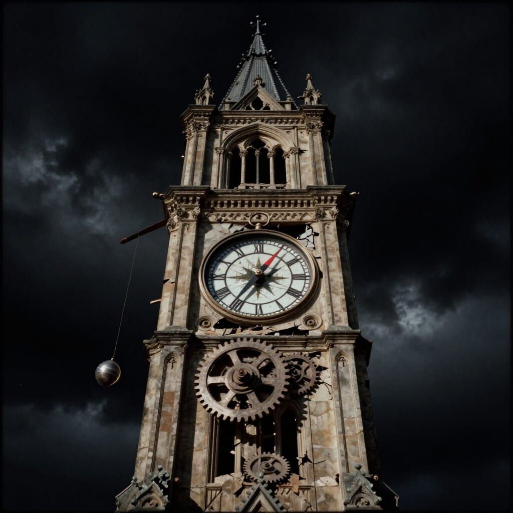 A cinematic film still captures a decaying clock tower against a stormy sky. Dramatic lighting reveals broken clockwork and a spinning compass, evoking futility. Features film grain and high contrast.