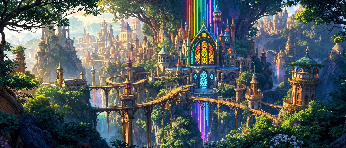 A vibrant elven city nestled among the treetops. Rainbow light emanates from a central hall, illuminating the intricate wooden architecture with a prism of colors in a hyperrealistic aesthetic.
