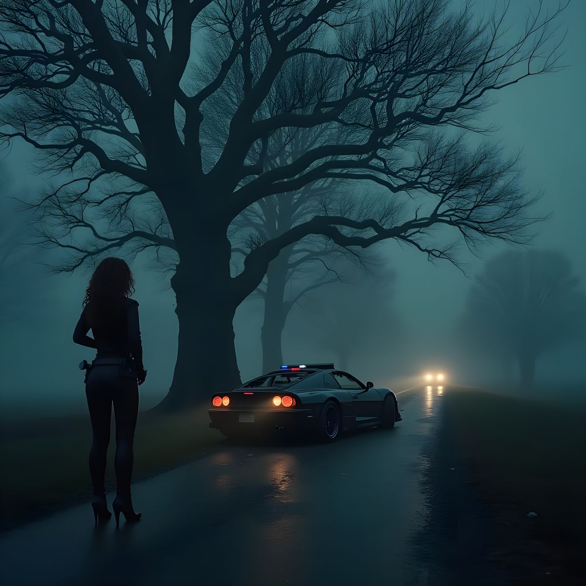 A dramatic scene of a car crash on a dark country road, with a police officer, a woman, flagging down a motorist in the distance, amidst the wreckage of a vehicle that has crashed into a huge tree.
