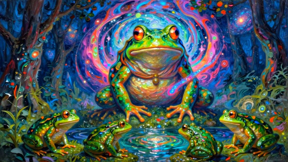 "Hyper-realistic Hyper-detailed Nighttime forest textures of thick impasto light painting colossal, ancient Anthropomorphism human-frog-god ...