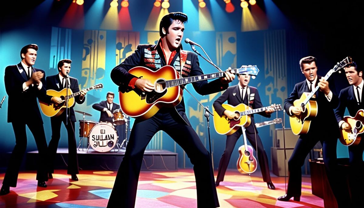 This image shows Elvis Presley performing on the Ed Sullivan Show in alcohol ink style. The artwork features vibrant colors, deep shadows, golden stage lighting, and high contrast to create a nostalgic, iconic scene.