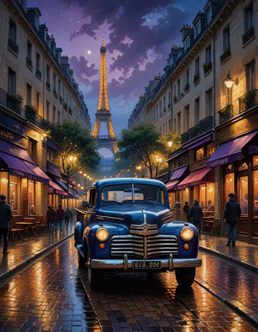 This enchanting oil painting depicts a vintage truck in the heart of Paris at night, bathed in warm golden hour lighting and surrounded by the soft glow of streetlights reflecting on wet cobblestones, set against a dark blue and purple night sky.