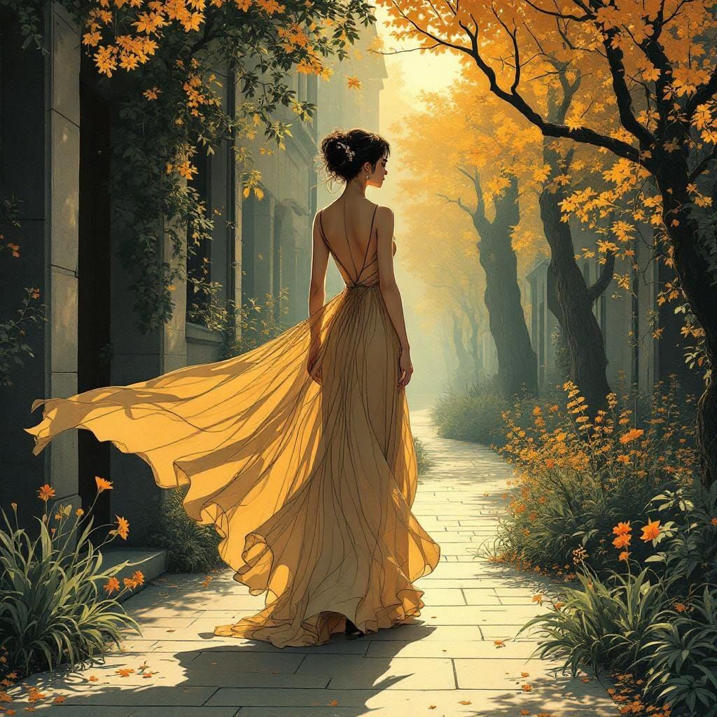 This image showcases a woman in a gown, blending bold silhouettes with intricate linework, embodying decorative lithographic sophistication and classical ornamental beauty in a vintage color palette.