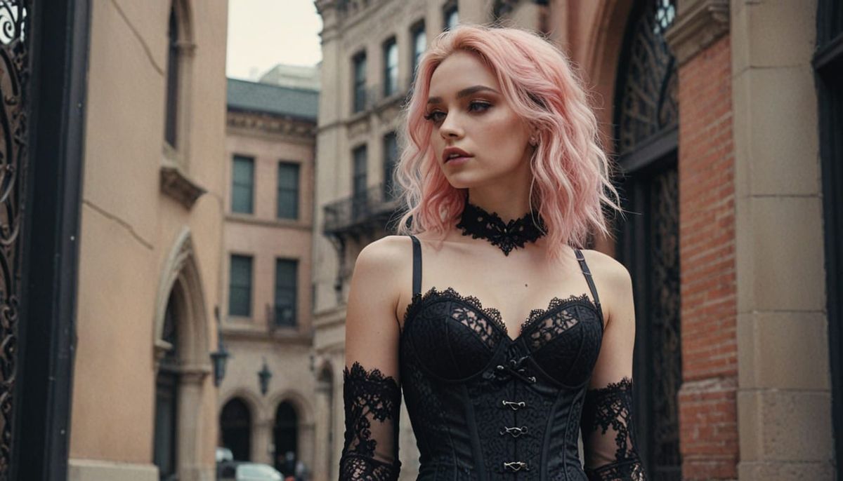 A vibrant digital art image of a confident woman in gothic chic style. She stands in a downtown setting, showcasing intricate lace details and bold blush colors in soft, diffused light.