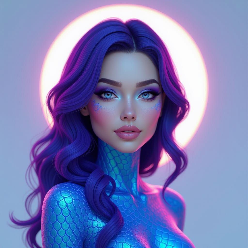 A striking portrait of a female alien with blue scales and purple hair. The image is lit with dynamic lighting and rendered with intricate textures and organic flourishes, in a dramatic digital art style.