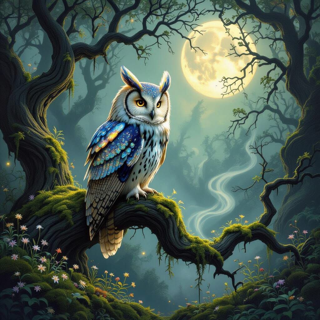 Fantasy art. A majestic owl with luminous feathers perched on a gnarled, ancient tree branch. The forest floor is carpeted with glowing moss and delicate wildflowers. A gentle mist weaves through the trees, illuminated by ethereal moonlight. Highly detailed, dreamlike atmosphere, ethereal lighting, intricate ...