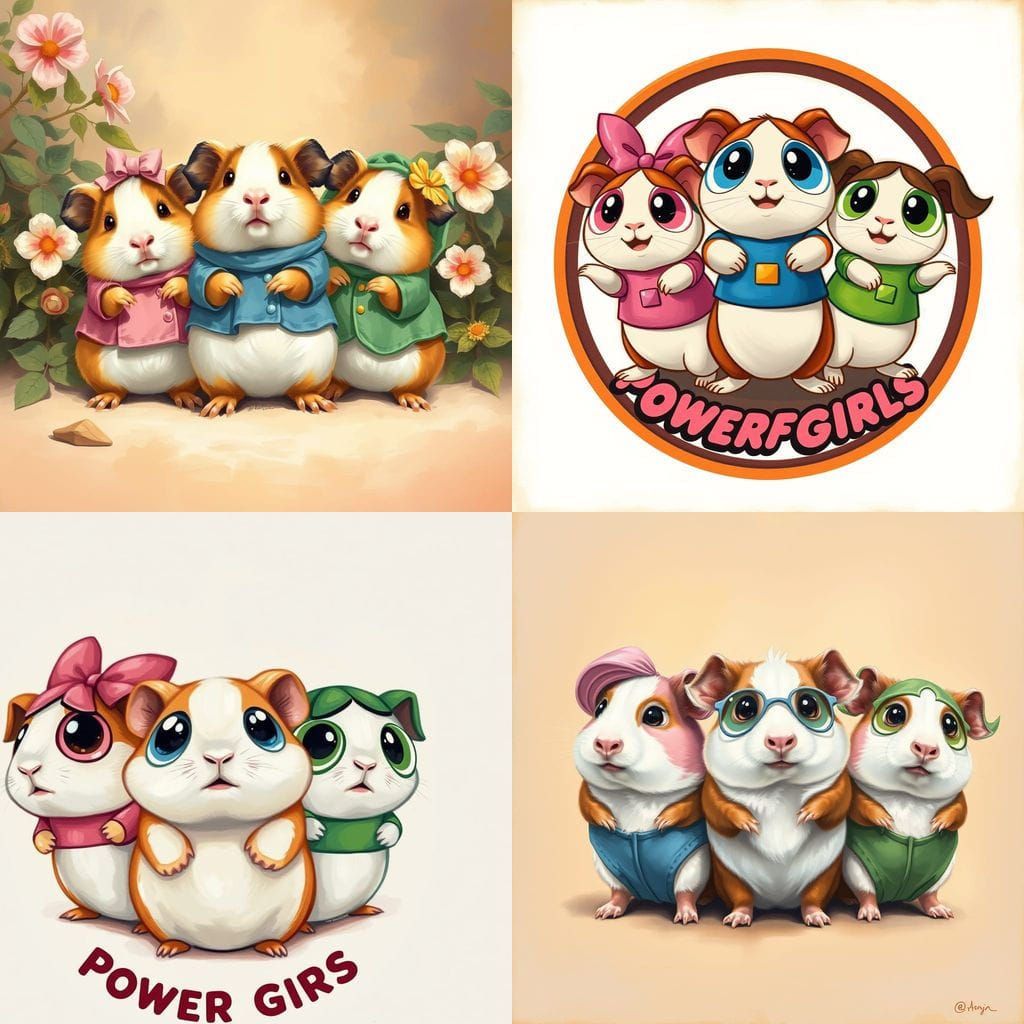 This whimsical oil painting depicts three adorable guinea pigs as the Powerpuff girls, surrounded by a nostalgic logo in soft pink, blue, and green hues, evoking a sense of childhood wonder and classic artistry